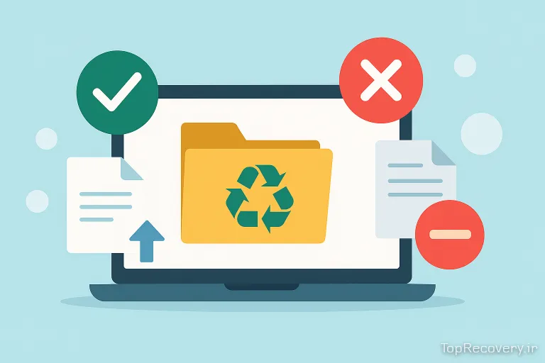 اولین قدم بررسی Recycle Bin است. اگر فایلها آنجا نباشند، باید از نرمافزارهای معتبر یا خدمات تخصصی مراکز بازیابی اطلاعات استفاده کنید.